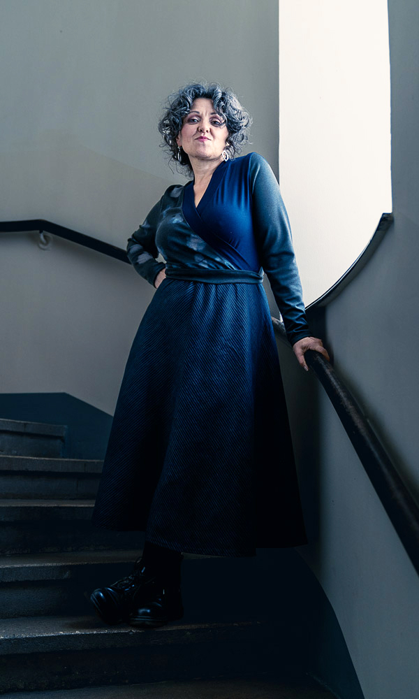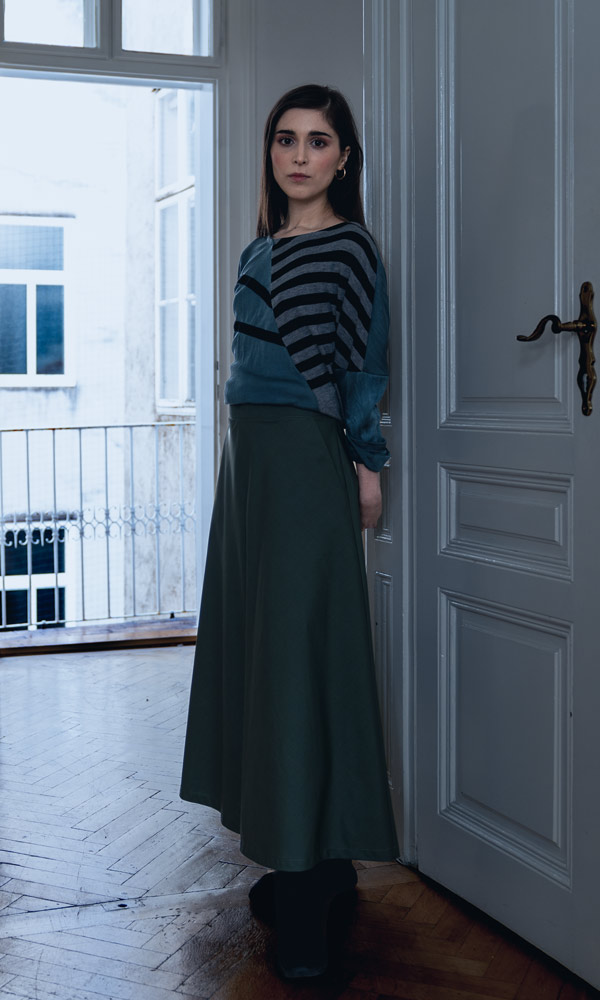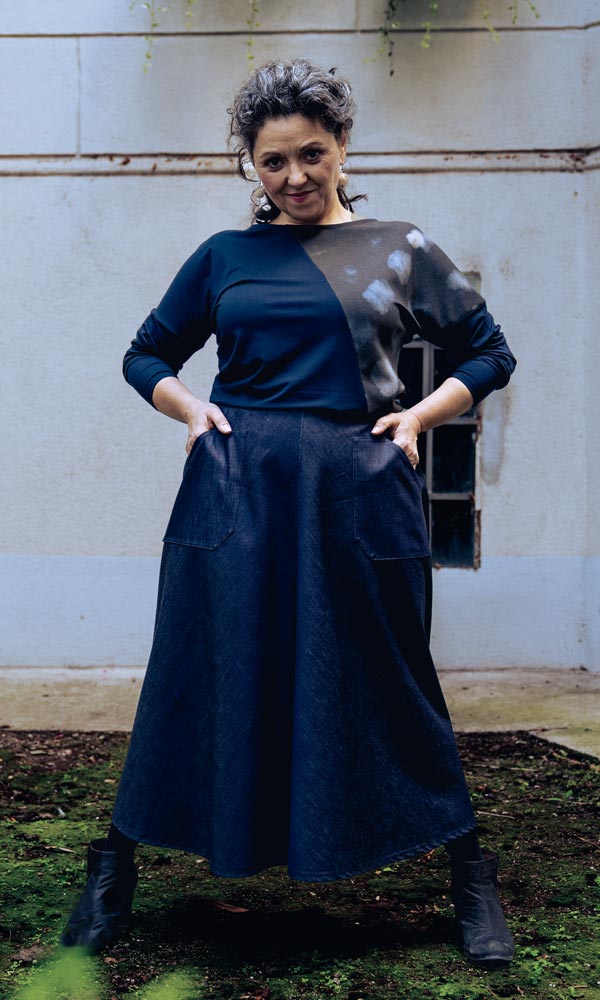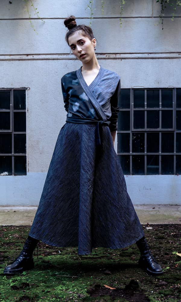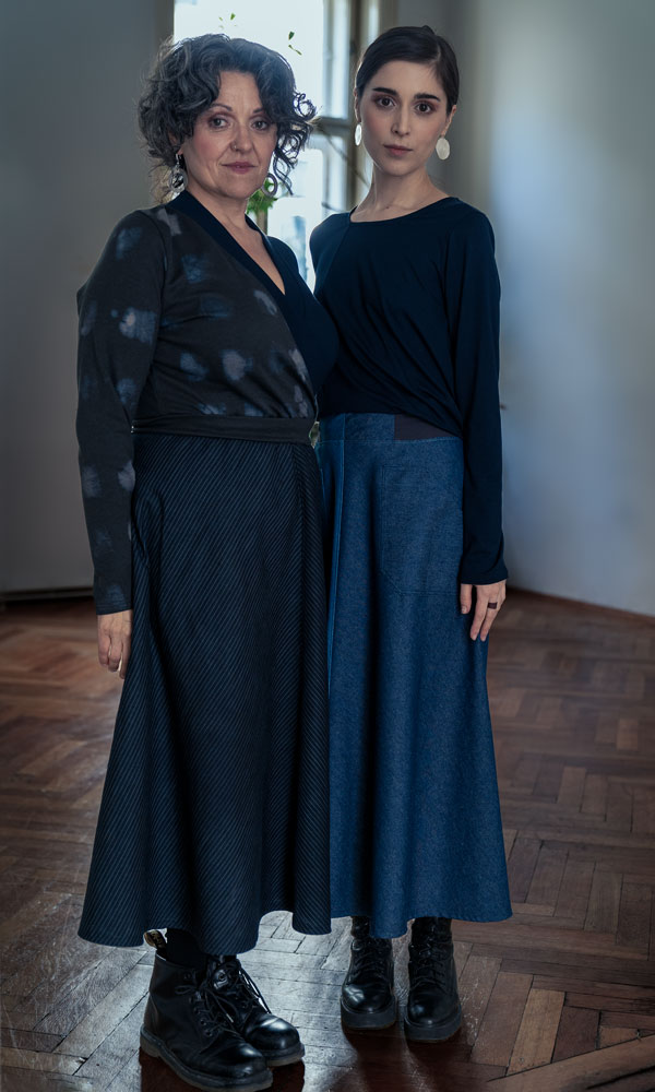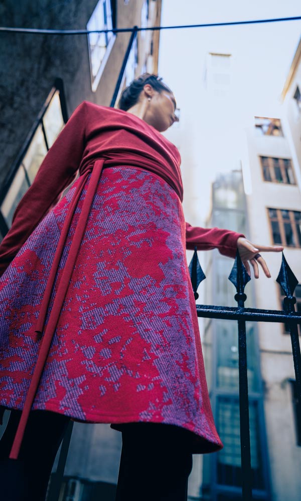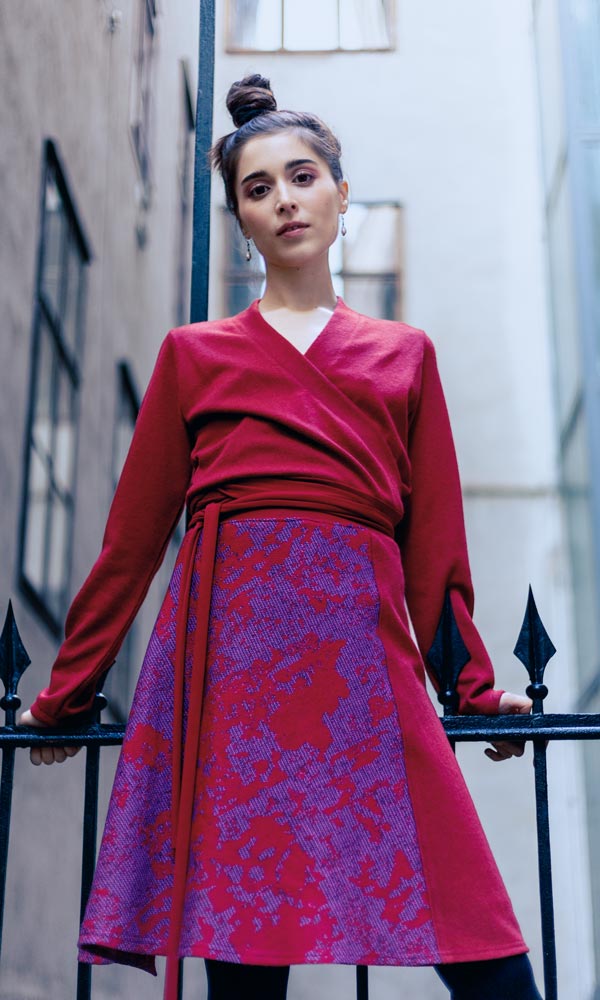 Zum Blau in spannenden Kontrast habe ich Rot- und Rosétöne gestellt. Röcke aus weich fallender Baumwolle, Wickelpullis aus zarter Merinowolle – ich bin sehr wählerisch, was meine Stoffe betrifft und für meine Oberteile verwende ich nur Material, das sich auf der Haut wirklich angenehm anfühlt. Nachhaltige Mode heißt eben auch, dass du richtig Freude an meinen Sachen haben sollst.